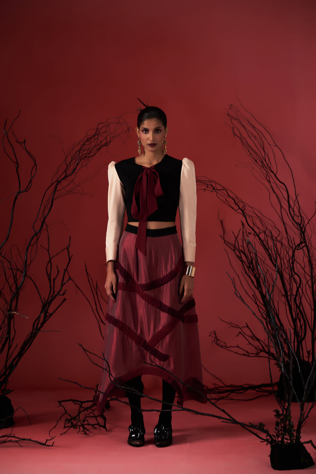 Cut-Out Shoulder Pattern-on-pattern cotton Shirt with Boot-Cut Embellished Denim Coord Set. Shirt has a concealed placket and peplum pleats suitable for all body-types.