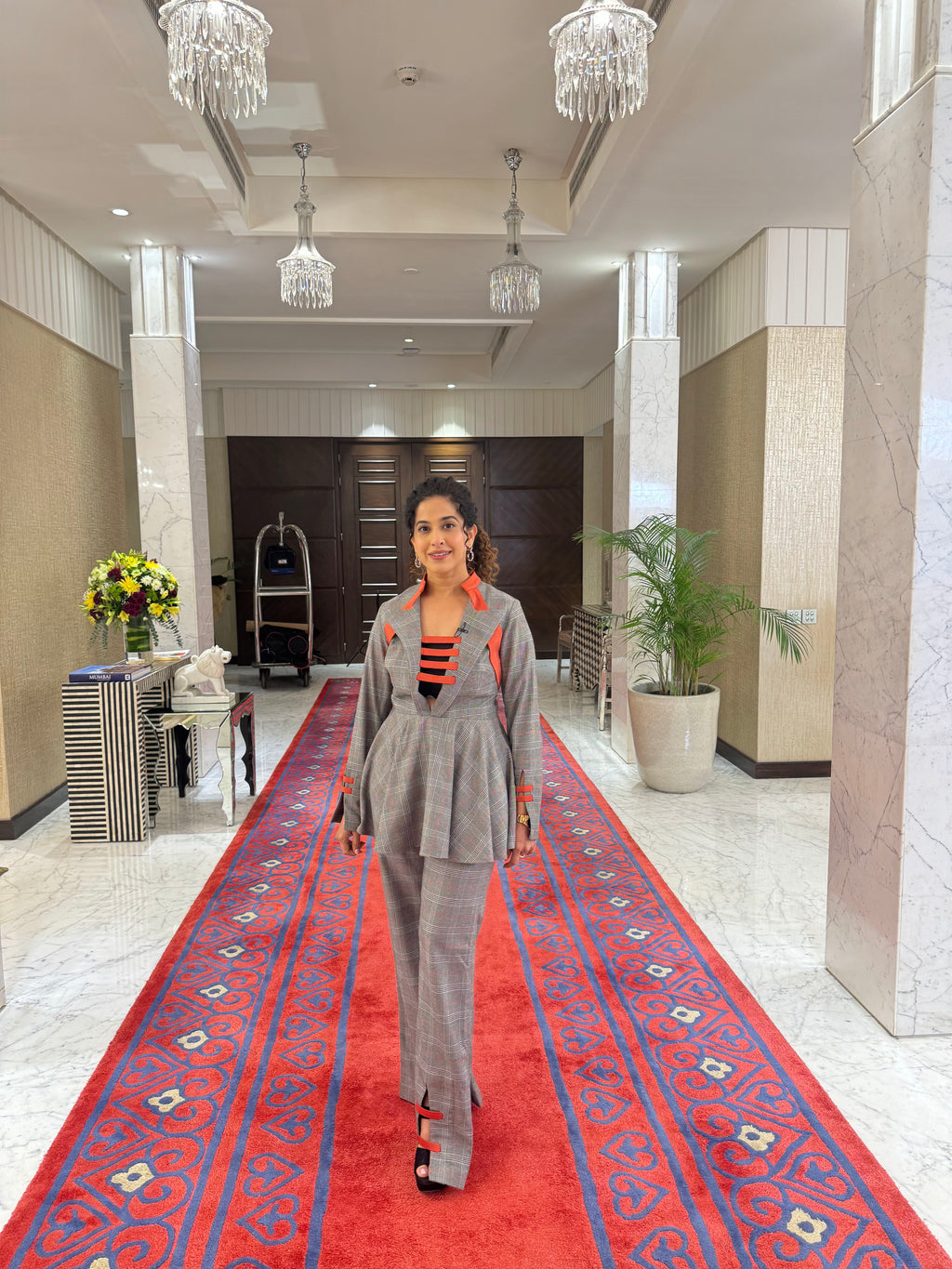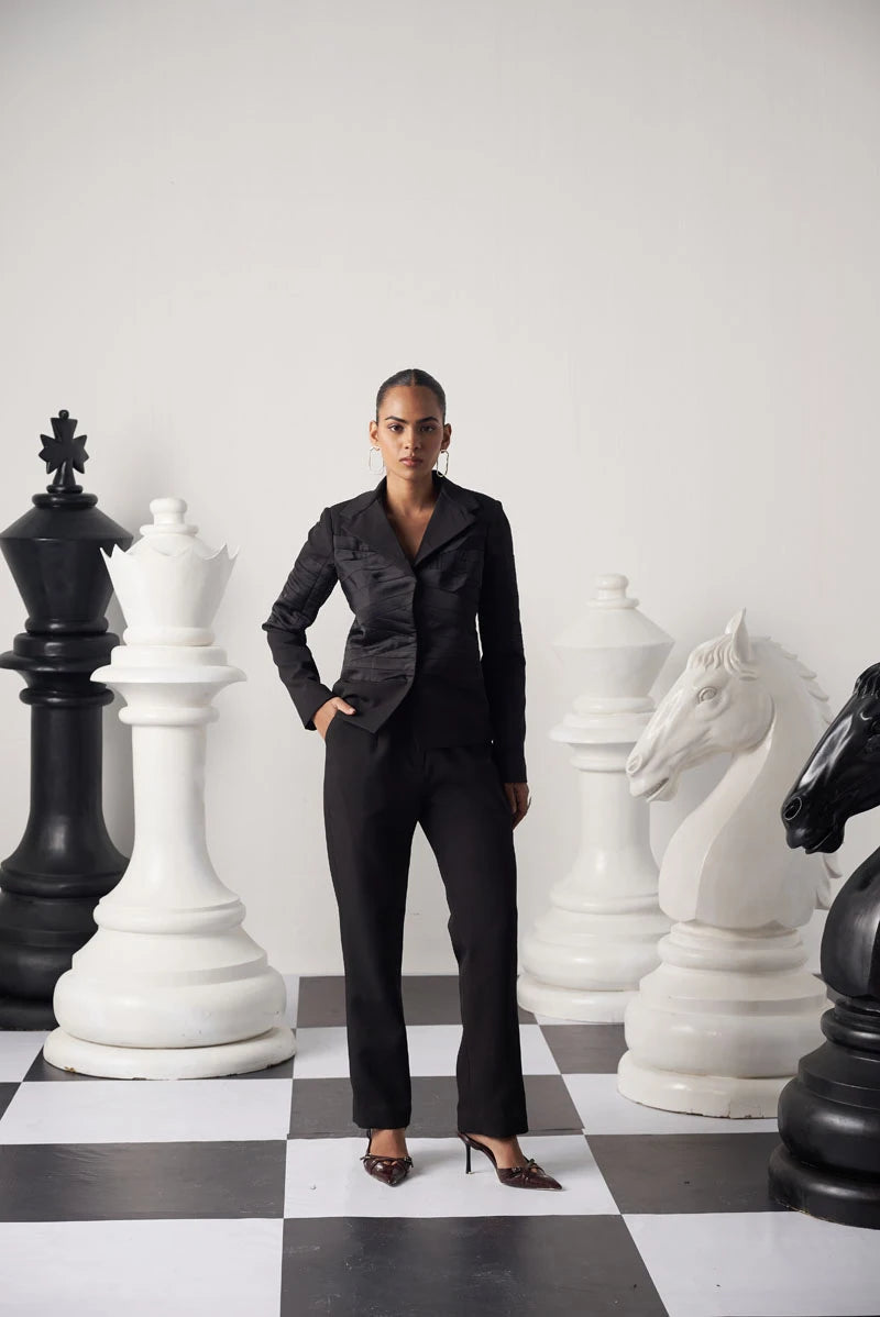 Quilted three-fourth sleeves with contrast red top stitch. Hoodie at the back. Front open.Calf Length skirt with drawstring along the sides and red top stitch over belt.